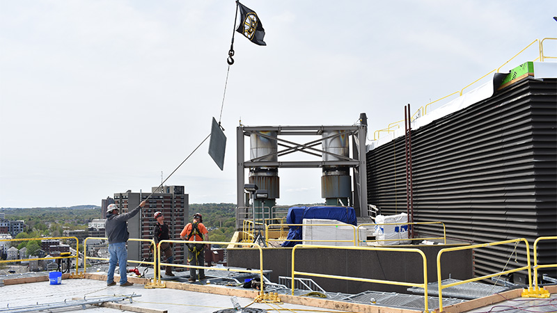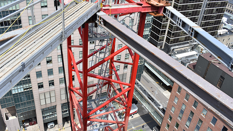 The list of challenges to overcome on a project site located 265 feet in the open air, are many. Laydown area, working space, safety railings, fall protection, access to the job site, and determining how materials are arriving are only a few. Imagine the safety concerns for the general public, patients and employees while building over one of the hospital’s main entrance and surrounding sidewalks. Additionally, the street directly below the project (Shattuck Street) is the main road traveled for ambulance access to both Brigham and Women’s as well as Boston Children’s Hospital. The challenge of how NOT to interfere with the work of the medical staff and patient care and residents of the neighborhood was the main priority in the planning.