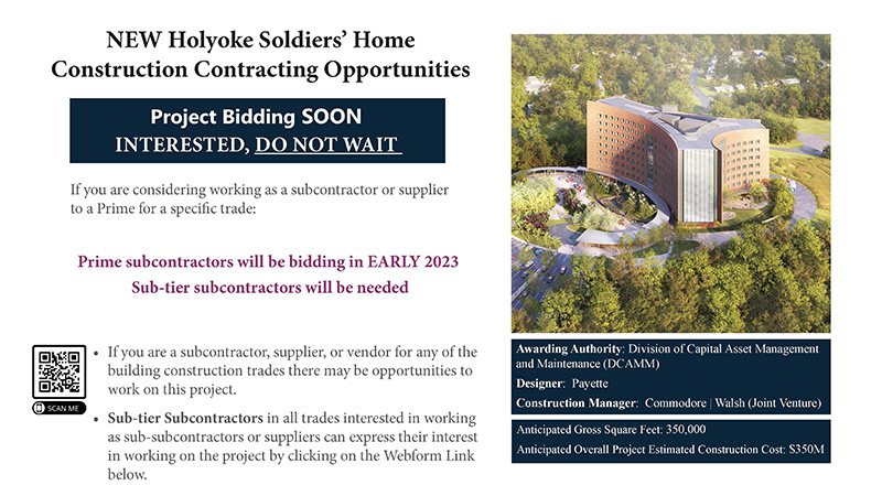 If you are a subcontractor, supplier, or vendor for any of the building construction trades there may be opportunities to work on the New Holyoke Soldiers’ Home project. Sub-tier Subcontractors in all trades interested in working as sub-subcontractors or suppliers can express their interest in working on the project by filling out the Webform Link here: https://lnkd.in/eB8d9rZn
