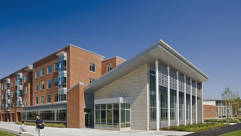 Crimson Hall, a 408- bed, suite-style residential community on the Bridgewater State University campus, consists of two buildings of five stories each, tied together with a connecting bridge.