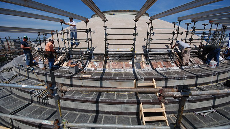 Problems arose when the waterproofing within the elliptical Dome structure began to fail, allowing water penetration through the Dome’s structural concrete onto the library floor in various areas, which in turn was compromising the collections of books and valuable research. When the source of the leaks and the most appropriate remedy was determined, the existing limestone was dismantled, the concrete system below was repaired, a Kemper waterproofing system was applied and the non-damaged original limestone was reused. After withstanding more than 100 years of New England winters, some of the original limestone had discolored and had to be replaced. The origin of the limestone was traced to a particular quarry in Indiana and more than 300 new stones were carefully integrated and woven together with reused stones after the waterproofing was completed.