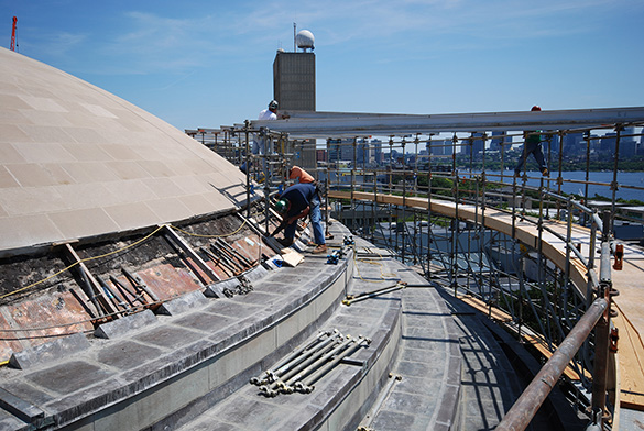 MIT’s iconic Dome, which serves as a landmark for this premiere institution of higher education, was beginning to fail after years of environmental elements causing leaks in the roof. The Dome caps the Barker Engineering Library, which houses an historically significant collection of engineering journals that have specific humidification requirements.