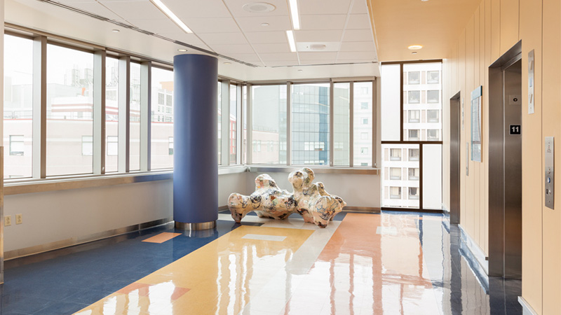 This 14-story elevator tower addition, constructed on the side of the Fegan Building on the Boston Children’s Hospital campus, sits above and passes down through four existing lobbies where three buildings join together. This core area was kept open for staff and public access for the duration of the project. The new tower provides to staff, patients, and visitors a new lobby and three new traction elevators.