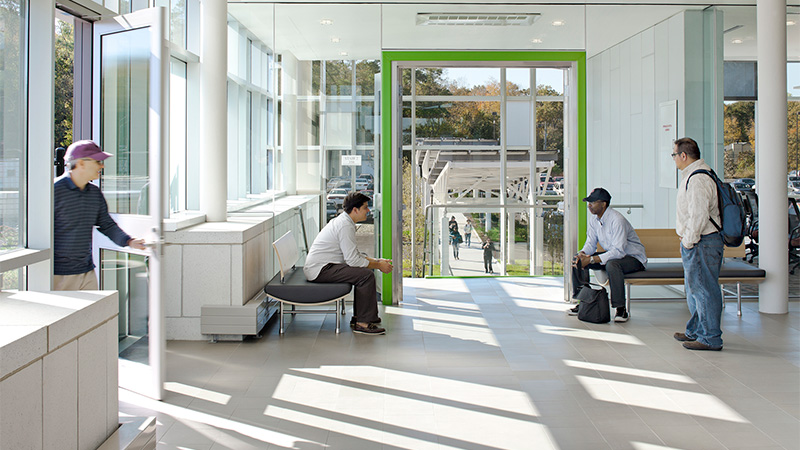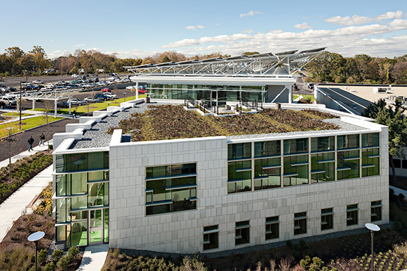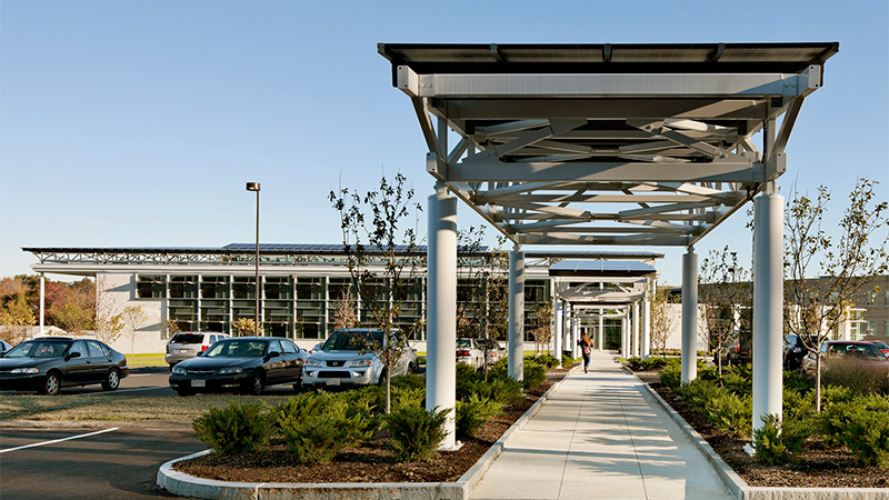 The sustainable goals set for this project were ambitious. Solar photovoltaic systems were installed on the main roof of the building and on walkway canopies in the parking lot to capture sunlight and turn it into energy. The system was designed to match and offset energy consumed in the building with solar energy produced throughout the course of a year. Additionally, 50 geothermal wells use the relatively constant earth temperature to provide heating and cooling for the building. The green roof increases insulation of the building and was installed with the aid of the students from the Essex Agriculture School. The 15,000-gallon gray-water system captures rainwater in a holding tank that is then used to flush toilets and irrigate the plantings. Chilled J-beams and daylighting also lessen the demand on natural resources. This groundbreaking project is currently being used as a benchmark for today’s energy-efficient facilities.