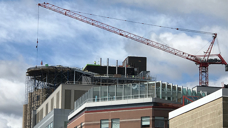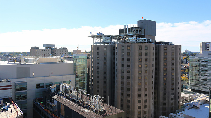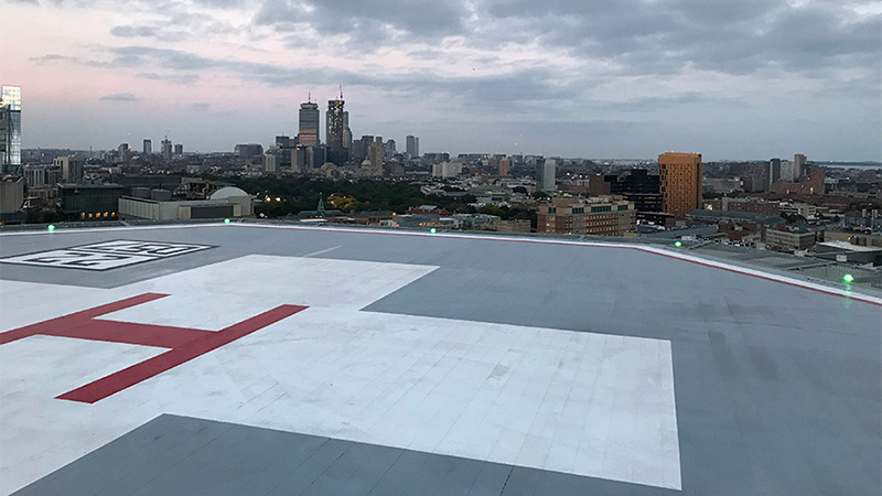 In order to provide a clear flight approach that coordinates with adjacent roof lines, the BWH Helipad was built approximately 25’ above the existing roof on the BWH Tower Building. A prefabricated mechanical unit was installed under the Helipad decking to support the new utility infrastructure. It houses the Helipads activated foam fire suppression system and the glycol snow melt system for the Helipad and walkways. The elevator extension was framed from steel and was clad with a prefabricated exterior wall system in order to be built more safely.