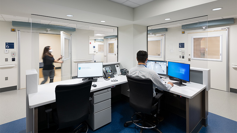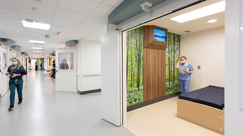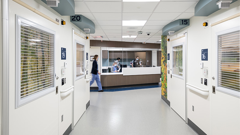 In one of the busiest Emergency Departments in the northeast, the Acute Psychiatry Service (APS) sees over 7,000 patients per year. The project, completed within the active ED, was expedited to solve an urgent need for APS space in the Emergency Department. This complex 6,700 square-foot renovation took place in two older buildings (1822 and 1969) on the main hospital campus. The newly renovated space provides 20 private rooms, two nurse stations, and incorporation of ligature-resistant components and complex security systems.