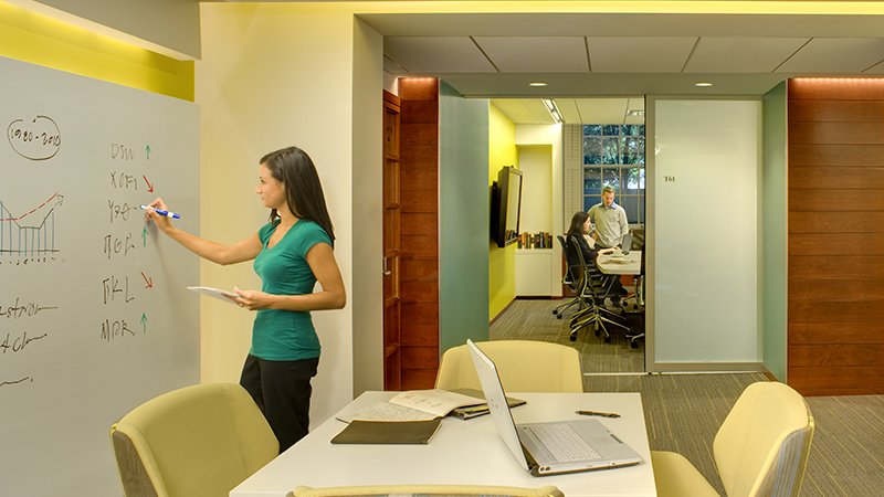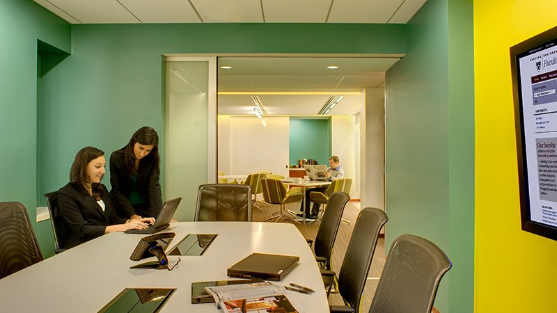 Constructed in 1928, this landmark institution’s historic building was in need of some significant restoration and adaptive reuse work. The 4,000 square-foot renovation required the demolition of existing office space and transitioned into a more open and collaborative floor plan. The restoration provided new conference rooms with state-of-the-art video conferencing and lighting control features, informal learning areas, workstations with custom millwork, and bathrooms. The project also required the incorporation of new ductwork and piping for the bathrooms. Summer faculty and students occupied offices surrounding all sides of Morgan Hall throughout the project. The active abutters coupled with the building’s tight urban location on Soldier’s Field Road, one of the main routes in and out of Boston, required an extremely detailed work approach.