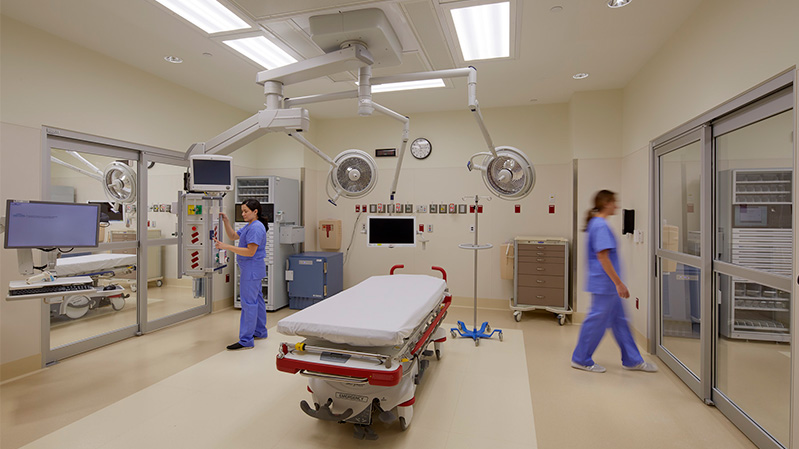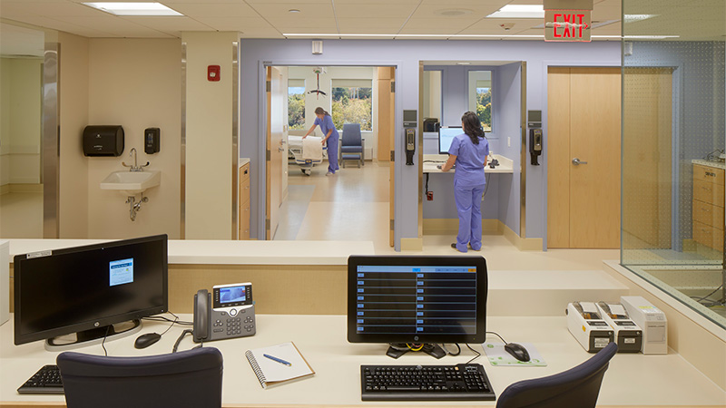 Constructed between the pre-existing structures, the new four-story facility connects to the existing hospital, creating a more welcoming front entrance and addressing complex campus wayfinding issues.