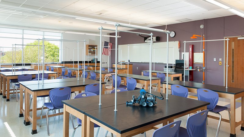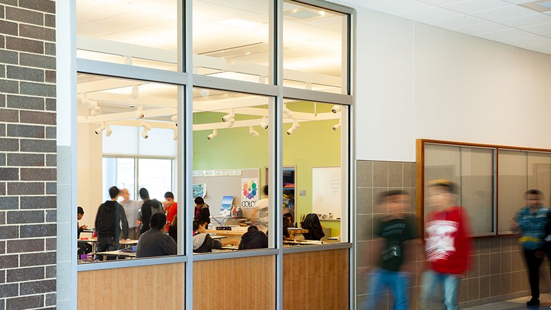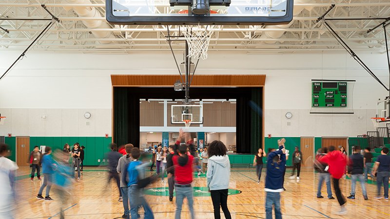 The new school features brick masonry and a glass front designed around a central entranceway. There are two wings housing classrooms and science labs. A gym and cafe share a mutual stage and can be used as an auditorium. The new Thurgood Marshall Middle School is LEED Silver certified. The new building will be sure to provide a sustainable and cost-effective learning environment for years to come.