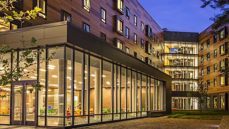 The new 135,000 square-foot University Hall dormitory houses approximately 410 students in semi-suite room arrangements of singles and doubles. The ground floor of the five-story building contains the building’s mechanical and electrical rooms, entry lobby, mail room, game room, laundry room, commons room with kitchen, security desk, resident director’s and other offices, meeting rooms, and the residence director’s two-bedroom apartment. One wing of the ground floor contains student resident semi-suite units; the rest of the floors are residential with student semi-suite units.  Each residential floor includes a common living room and study lounges.