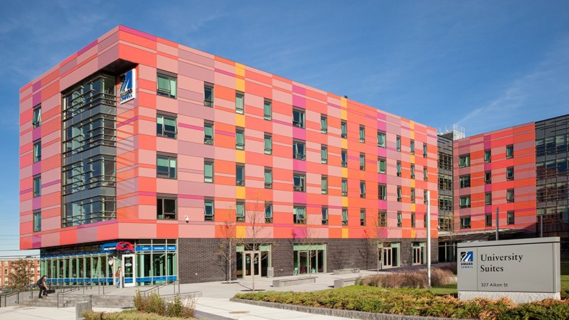 University Suites, located on the East Campus of UMass Lowell, houses 472 undergraduates in four- and six- bed suite-style apartments. This new 146,000-square-foot dormitory includes a cafe and multipurpose room that is open to the entire UMass Lowell community as well as a common lounge, common kitchen, and laundry room on each floor. The building is sited across from the Campus Recreation Center and surrounds a courtyard that features a paved seating area and open lawn space. University Suites is LEED Gold certified, incorporating many design elements to support sustainability including a 23,000-gallon rain tank that collects water from the roof that is used for irrigation.