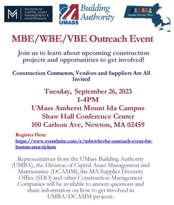 NEWTON, MA, September 22, 2023 – Walsh Brothers is excited to share that we’ll be gearing up to attend the MBE/WBE/VBE Outreach Event at the UMASS Amherst, Mount Ida Campus, hosted by the Division of Capital Asset Management and Maintenance (DCAMM), UMASS Building Authority (UMBA), and the Massachusetts Supplier Diversity Office. Please join us on Tuesday, September 26th to connect with our hosts and other construction companies to receive information on how to get involved in UMBA and DCAMM projects!